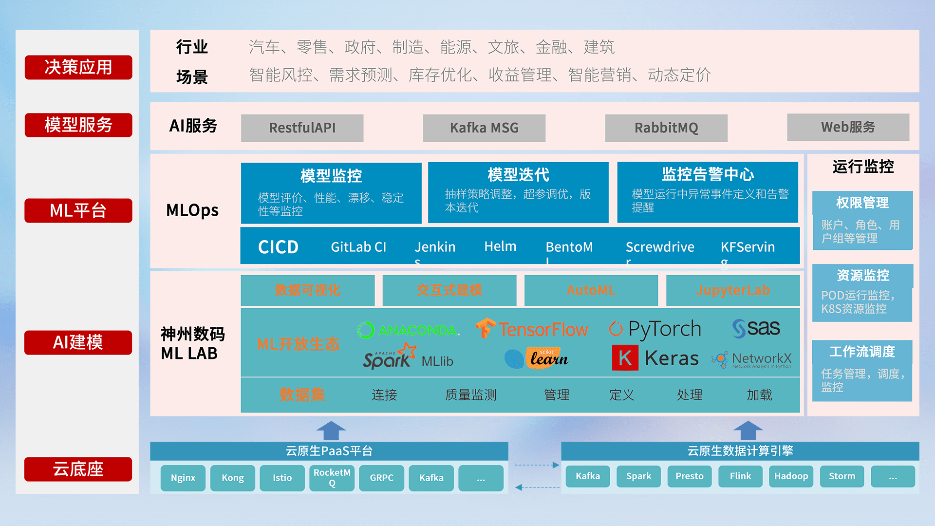 数据+模型双引擎驱动,,面向智能服务场景,,,,快速灵活利用AI技术,,支持业务决策,,助力企业智能化转型破局。。